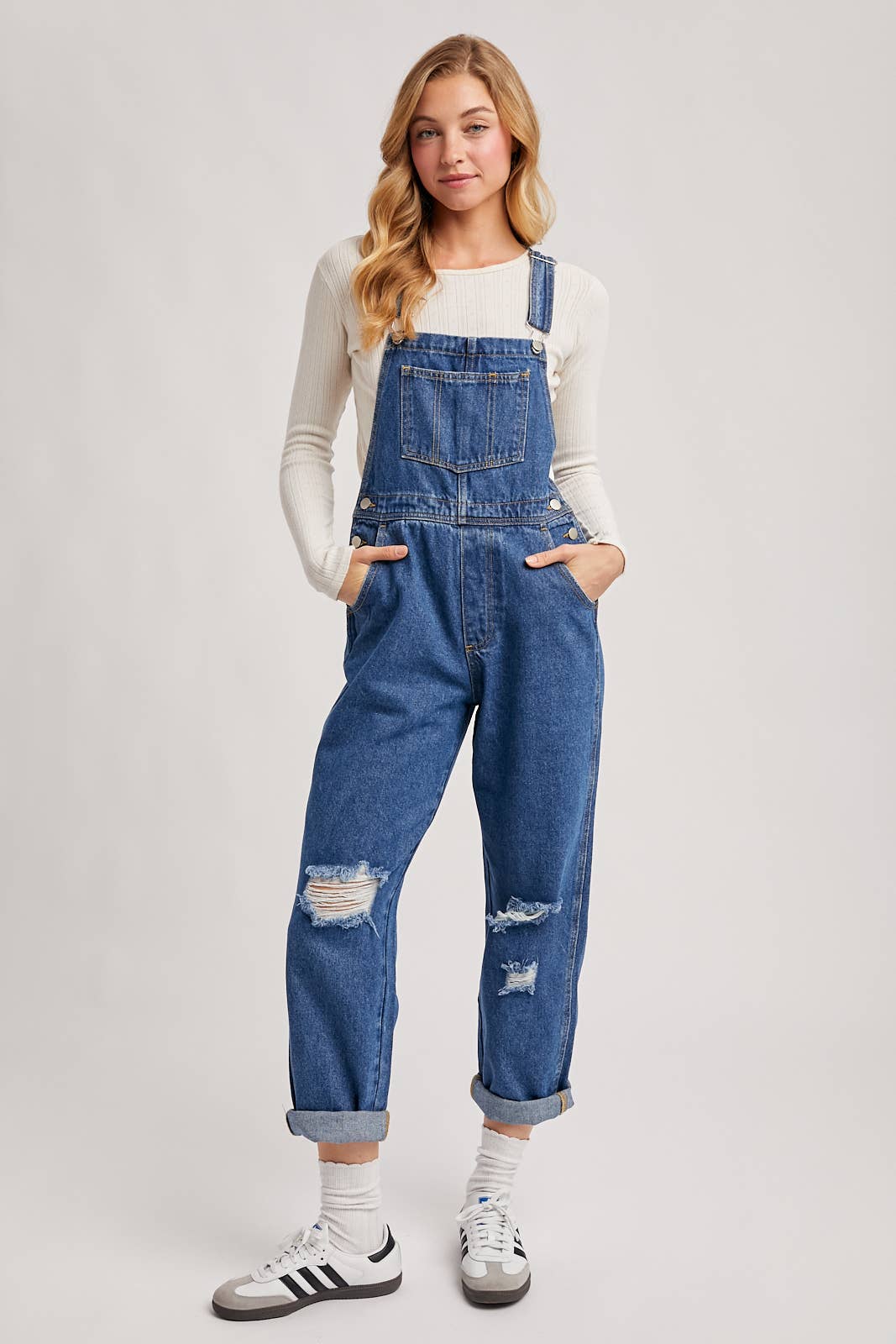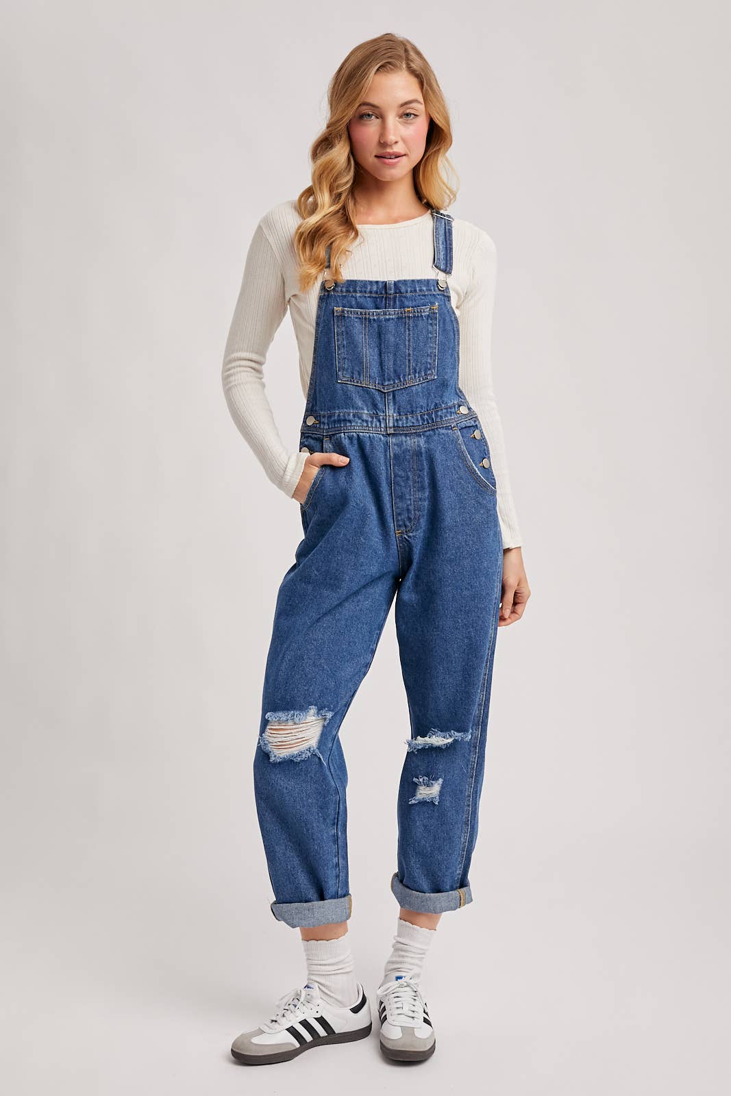 Denim overalls with baggy fit legs in medium wash, adjustable straps, side button closures, destroyed detail, front chest pocket with four pocket design. -Model is 5'9" and wearing a Small