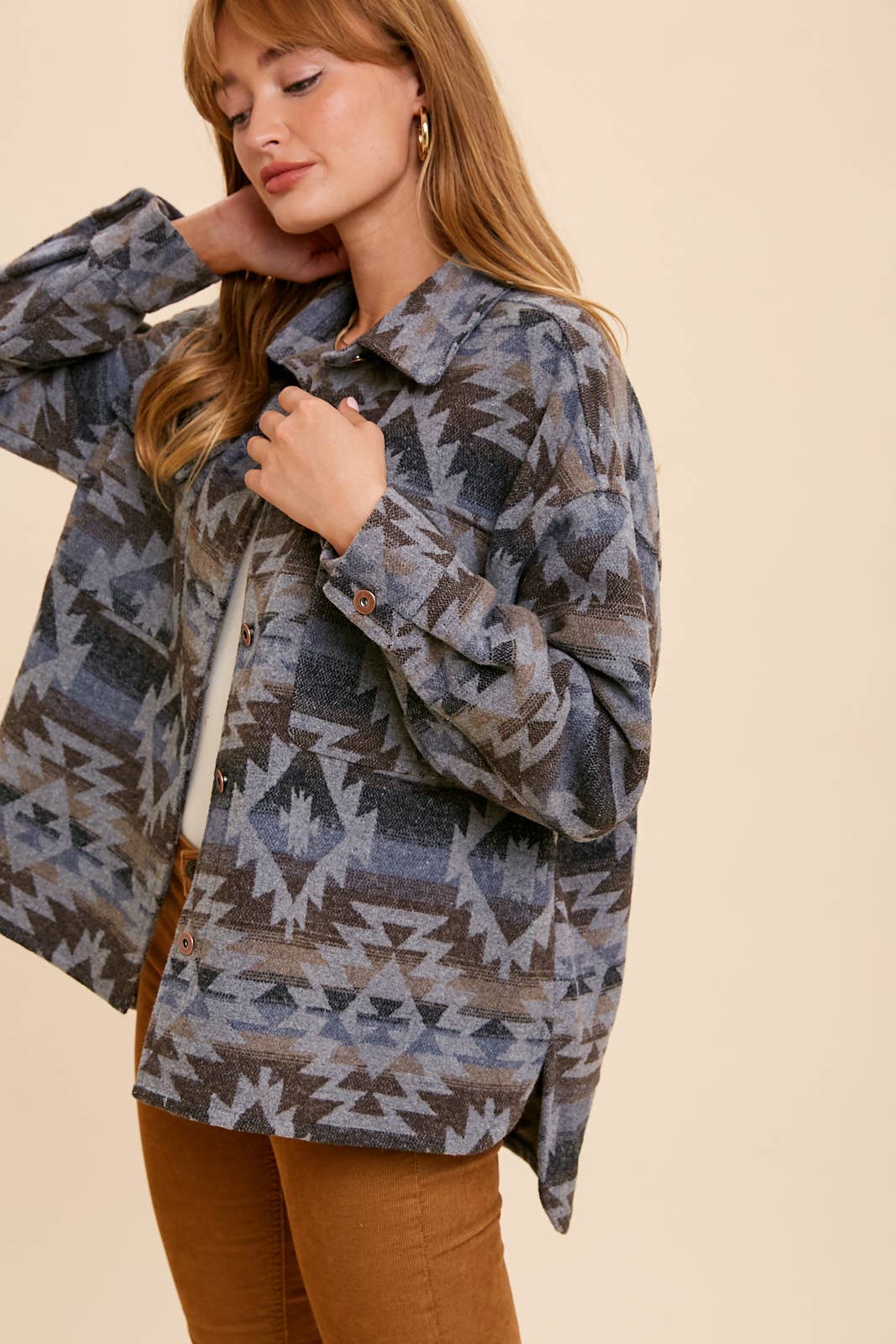 AZTEC PRINT SHACKET FEATURES FUNCTIONAL BUTTONED BREAST POCKETS, BUTTON FRONT, AND DROP SLEEVES.
