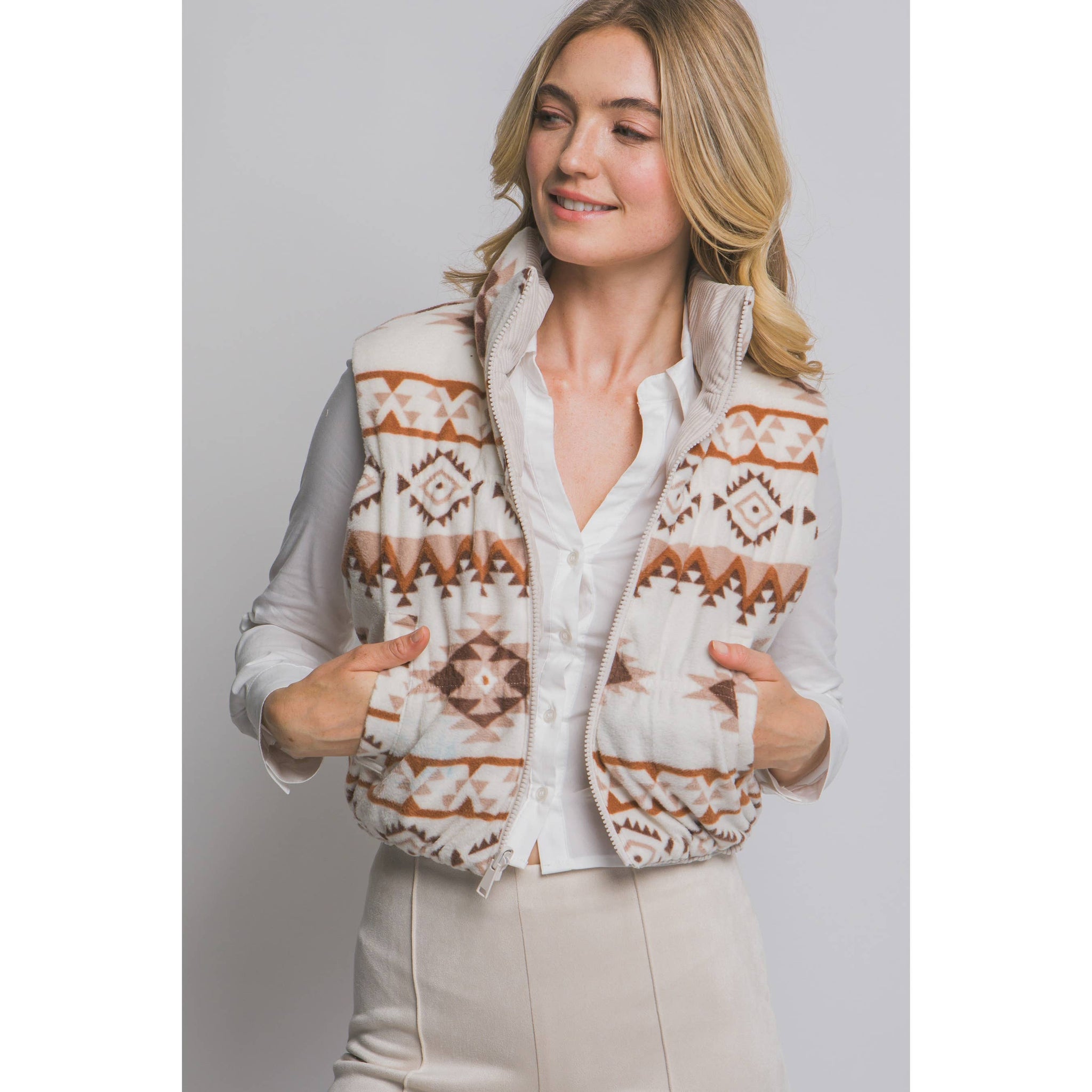 Elevate your winter layering with this reversible puffer vest featuring a plush corduroy exterior on one side and a vibrant Aztec-inspired fleece print on the other.